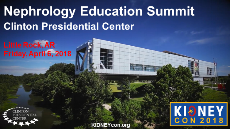 We are pleased to announce that KIDNEYcon 2018 will feature the Nephrology Education Summit. This will feature 6-7 talks on innovative ideas to enhance education in nephrology at the medical student, residency, fellowship, and attending levels. The summit will be held in the Great Hall of the Clinton Presidential Center in downtown Little Rock, AR and co-moderated by Drs. Matt Sparks and Kenar Jhaveri. The entire program is in the process of being developed and will be announced when all speakers are verified. We hope that you will join us.